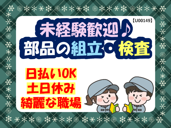 日払いOK|週払いOK|長期安定|土日休み|長期休暇あり|未経験歓迎|経験者歓迎|事前の職場見学あり|キレイな職場|車通勤歓迎|無料駐車場完備|交通費別途支給|休憩所完備|喫煙所完備|作業着無償貸与|
