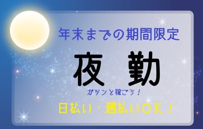 | 勤務時間 | 勤務曜日  月,火,水,木,金,土,祝祭日                         勤務時間  20:00~05:00                                                (8時間) 最低勤務日数 週3日【夜勤固定】                                                                                                                                                                             |