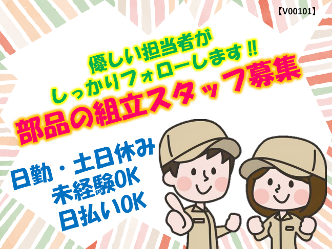 日払いOK|週払いOK|時給UP|日勤のみ|土日休み|長期休暇有|長期安定|未経験OK|ブランクOK|組立経験者尚可|車通勤OK|バイク通勤OK|自転車通勤OK|無料駐車場完備|交通費別途支給|弁当注文可|休憩所完備|喫煙所完備|