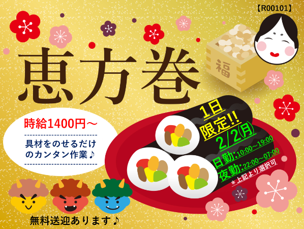 50名大募集!1日限定!2月2日のみ!日勤or夜勤より選択可!恵方巻の製造補助をお願いします!お友達同士のご応募もOK!無料送迎バスが利用できます!