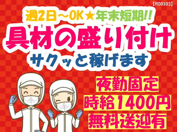 年末短期!週2日~OK!夜勤専従!具材を盛り付けるだけのカンタン作業!高時給1400円!更に22時~翌5時は深夜手当がプラス!無料送迎バスあり!