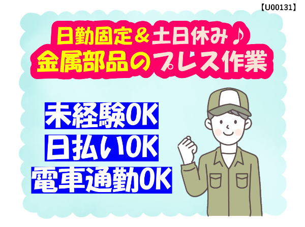 日払いOK|週払いOK|日勤のみ|土日休み|長期休暇あり|冷暖房完備|キレイな職場|未経験OK|難易度が低い作業|充実した教育あり|電車通勤歓迎|車通勤歓迎|無料駐車場完備|交通費別途支給|休憩所完備|喫煙所完備|