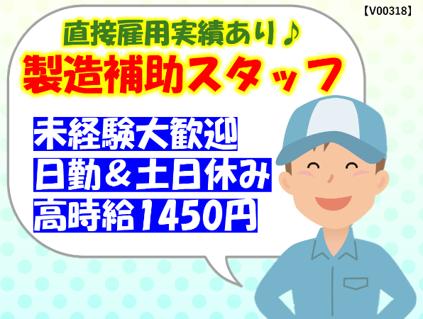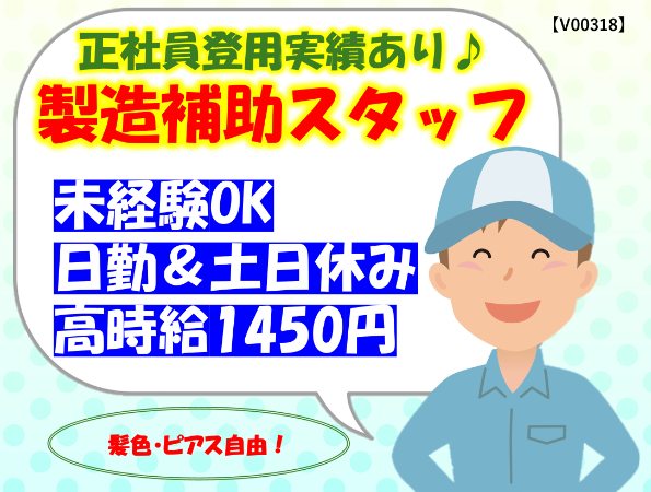 直接雇用実績あり!未経験OKの製造補助スタッフ大募集!日勤固定・土日休み!残業少なめ!髪色・ピアス自由!高時給1450円なので日勤のみでも稼げます!